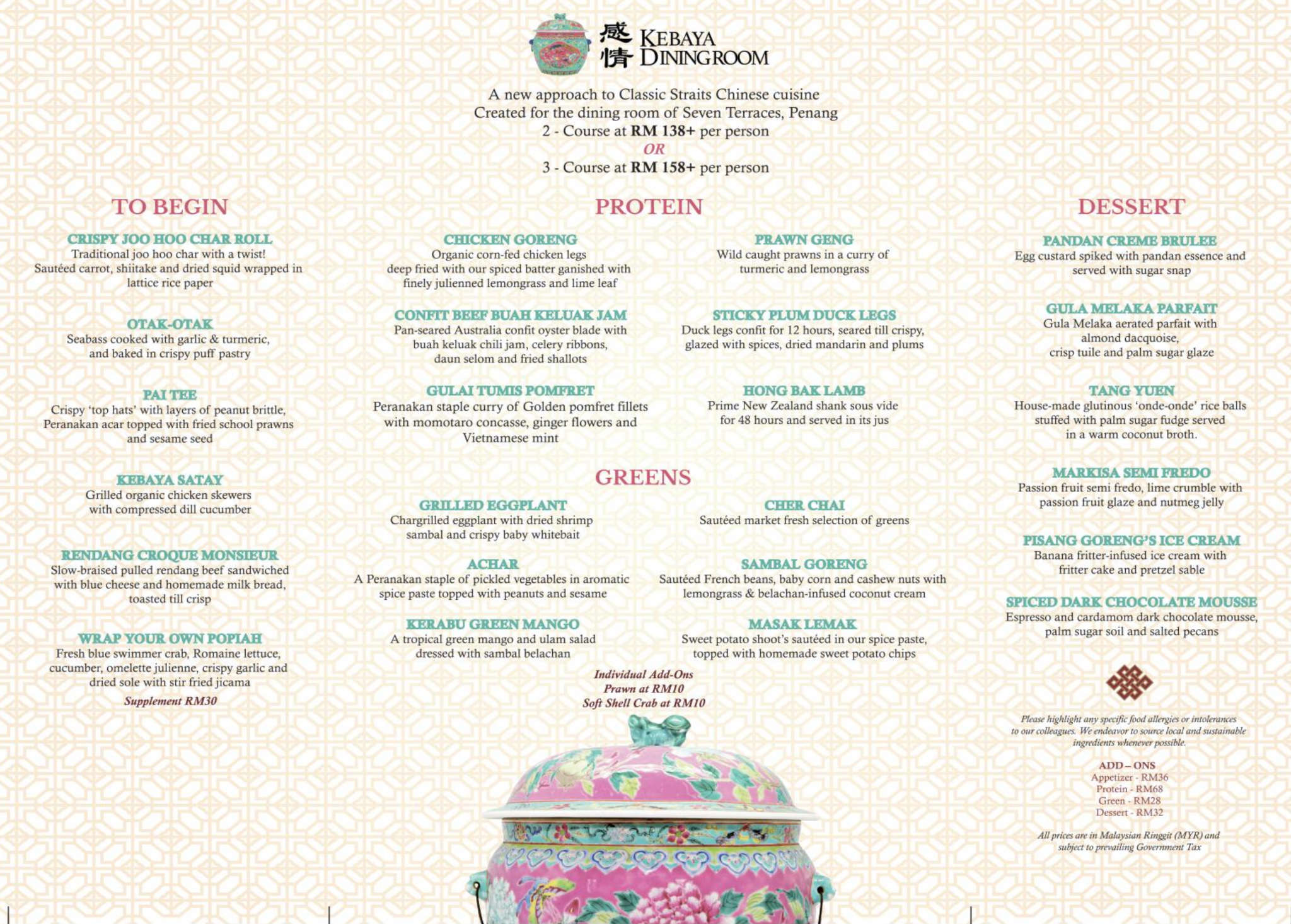 The Seven Terraces owned by Christopher Ong, a heritage-preserving and award winning hotelier, has worked with the hotel's chefs to create a menu of classic Indo and Straits Chinese Nyonya dishes. Along with Chef Zac and Chef Kent, Kebaya had undergone reinterpretation and de-construction to deliver surprising new twists of elevation in its serving.